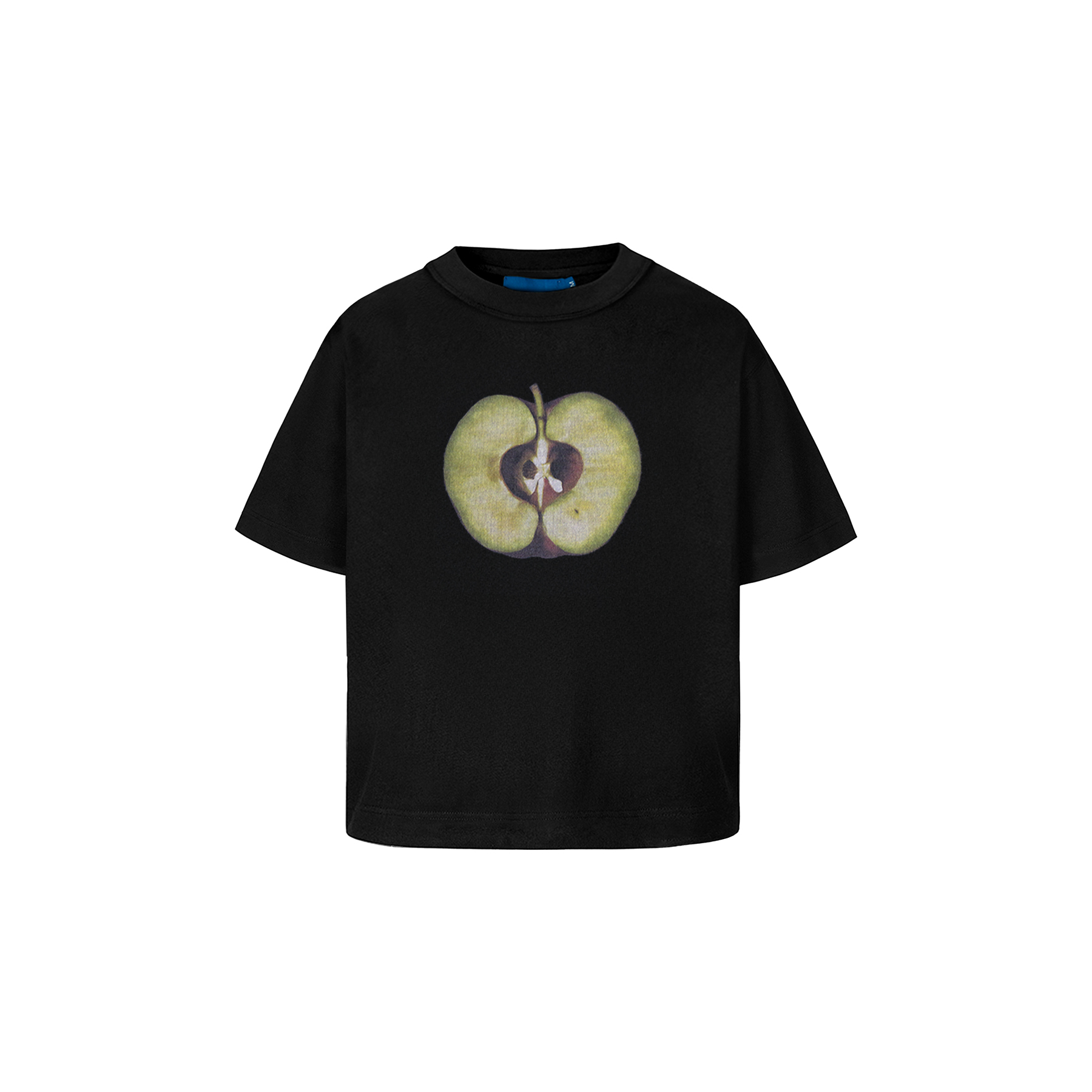 • Estamparia digital ‘Maçã’ centralizada no meio frente. Ilustração apresenta a maçã cortada ao meio com sua semente em forma de QC estilizado.
